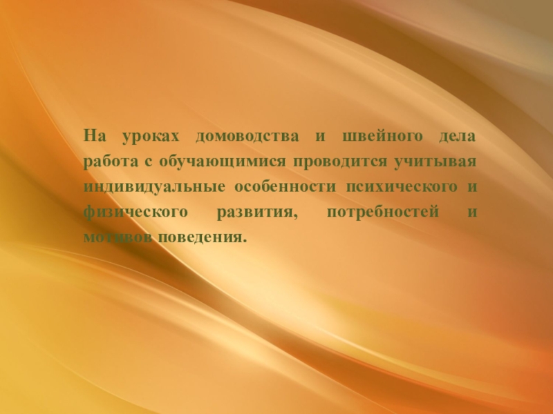 Слайд 15На уроках домоводства и швейного дела работа с обучающимися проводится учитывая