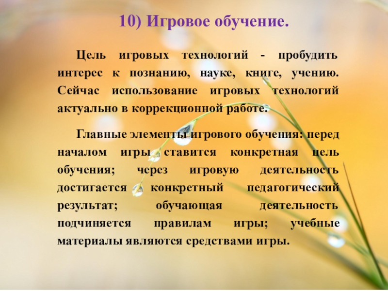 Главные элементы игрового обучения: перед началом игры ставится конкретная цель обучения; через игровую деятельность достигается конкретный педагогический результат; обучающая деятельность подчиняется правилам игры; учебные материалы являются средствами игры.