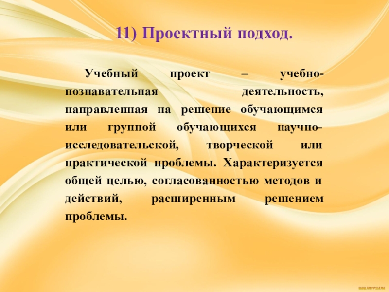 или группой обучающихся научно-исследовательской, творческой или практической проблемы. Характеризуется общей целью, согласованностью методов и действий, расширенным решением проблемы.
