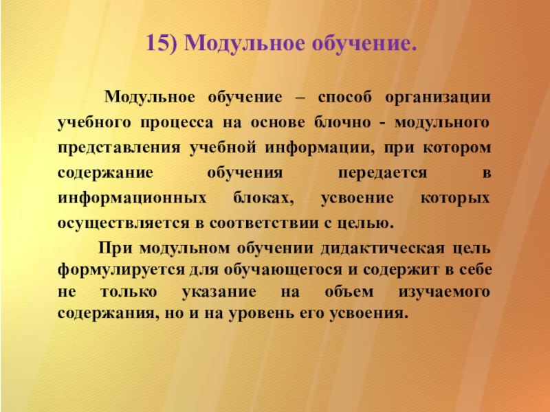 При модульном обучении дидактическая цель формулируется для обучающегося и содержит в себе не только указание на объем изучаемого содержания, но и на уровень его усвоения.
