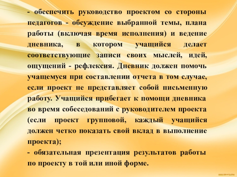 плана работы (включая время исполнения) и ведение дневника, в котором учащийся делает соответствующие записи своих мыслей, идей, ощущений - рефлексия. Дневник должен помочь учащемуся при составлении отчета в том случае, если проект не представляет собой письменную работу. Учащийся прибегает к помощи дневника во время собеседований с руководителем проекта (если проект групповой, каждый учащийся должен четко показать свой вклад в выполнение проекта);
