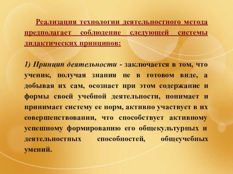 Слайд 17Реализация технологии деятельностного метода предполагает соблюдение следующей системы дидактических принципов: