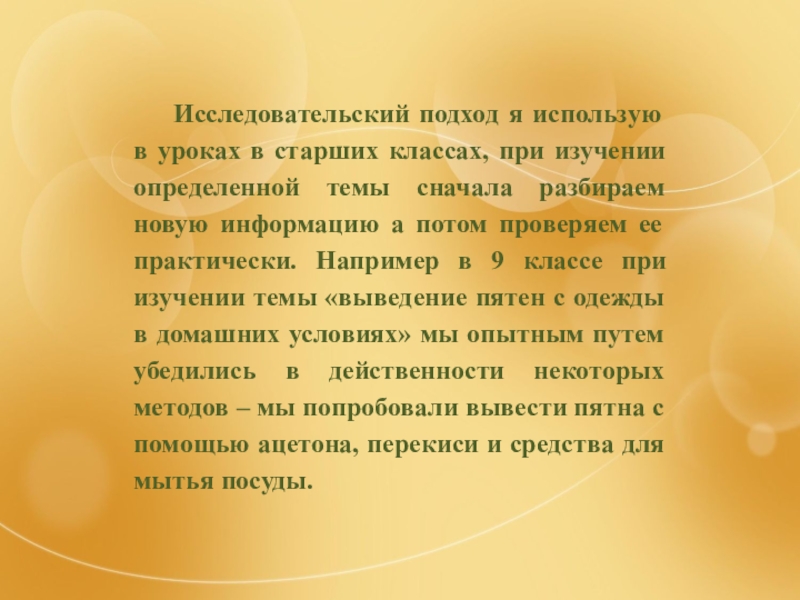определенной темы сначала разбираем новую информацию а потом проверяем ее практически. Например в 9 классе при изучении темы «выведение пятен с одежды в домашних условиях» мы опытным путем убедились в действенности некоторых методов – мы попробовали вывести пятна с помощью ацетона, перекиси и средства для мытья посуды.