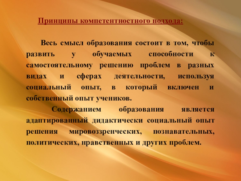 Содержанием образования является адаптированный дидактически социальный опыт решения мировоззренческих, познавательных, политических, нравственных и других проблем.