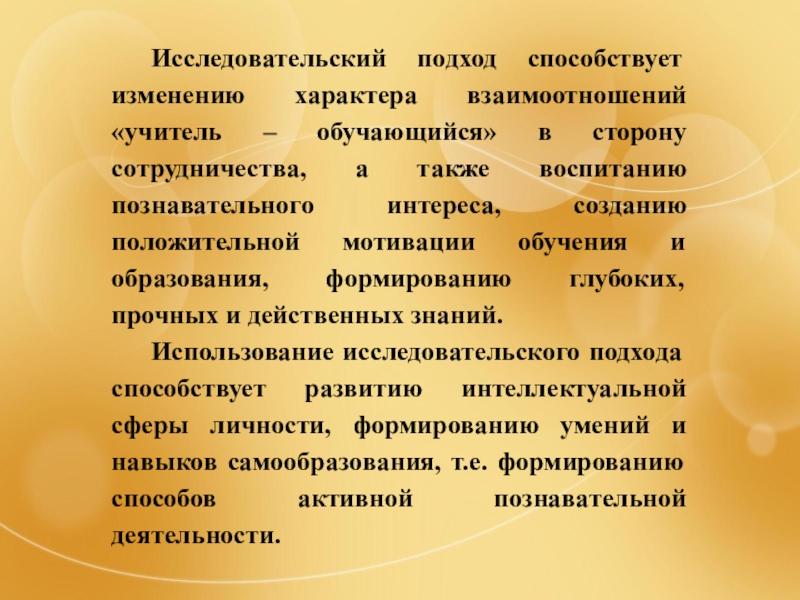 Использование исследовательского подхода способствует развитию интеллектуальной сферы личности, формированию умений и навыков самообразования, т.е. формированию способов активной познавательной деятельности.