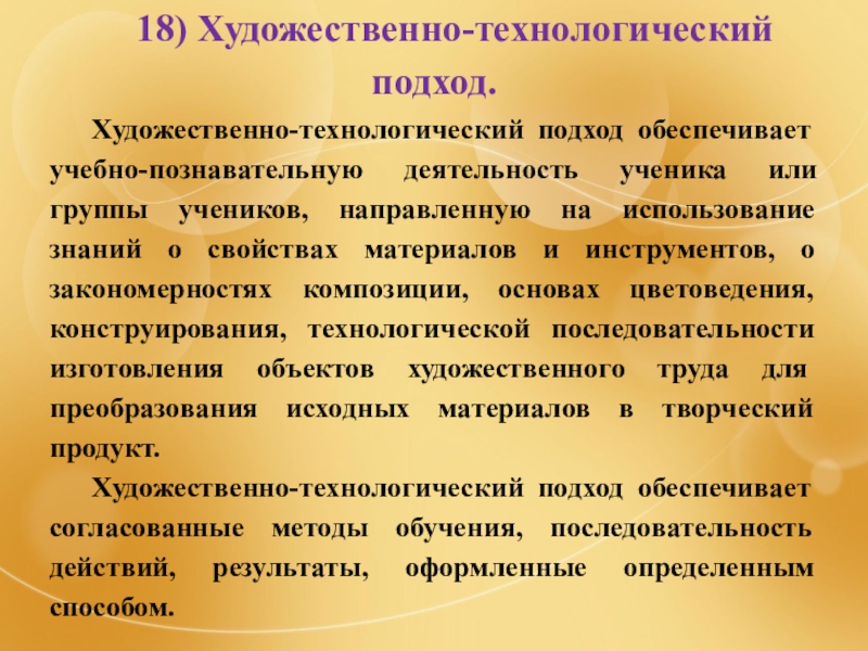 Художественно-технологический подход обеспечивает согласованные методы обучения, последовательность действий, результаты, оформленные определенным способом.
