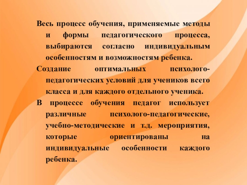В процессе обучения педагог использует различные психолого-педагогические, учебно-методические и т.д. мероприятия, которые ориентированы на индивидуальные особенности каждого ребенка.
