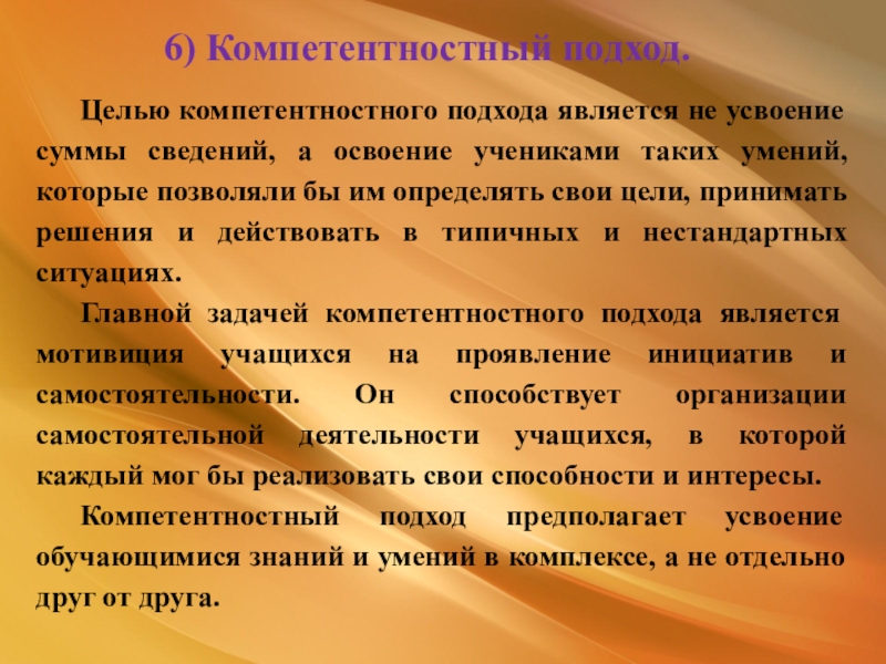 Компетентностный подход предполагает усвоение обучающимися знаний и умений в комплексе, а не отдельно друг от друга.