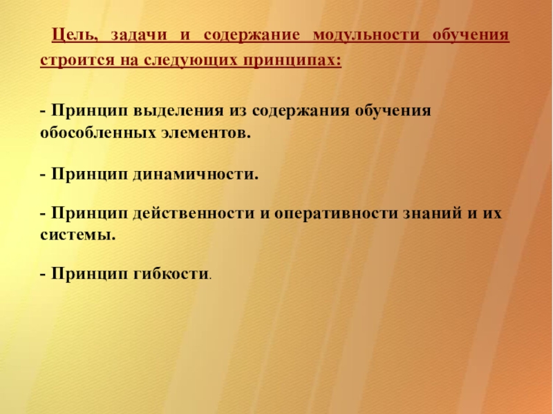 Слайд 45Цель, задачи и содержание модульности обучения строится на следующих принципах: