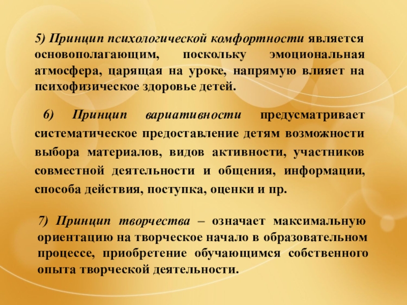 Слайд 195) Принцип психологической комфортности является основополагающим, поскольку эмоциональная атмосфера, царящая на