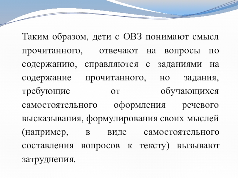 Слайд 23Таким образом, дети с ОВЗ понимают смысл прочитанного, отвечают на вопросы