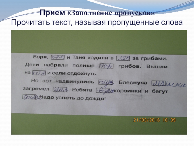Слайд 10Прием «Заполнение пропусков» Читать текст, называя пропущенные слова