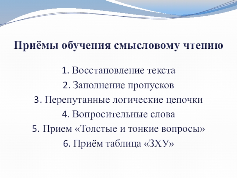 Слайд 2Приёмы обучения смысловому чтению 1. Восстановление текста 2. Заполнение пропусков 3. Перепутанные логические цепочки 4.