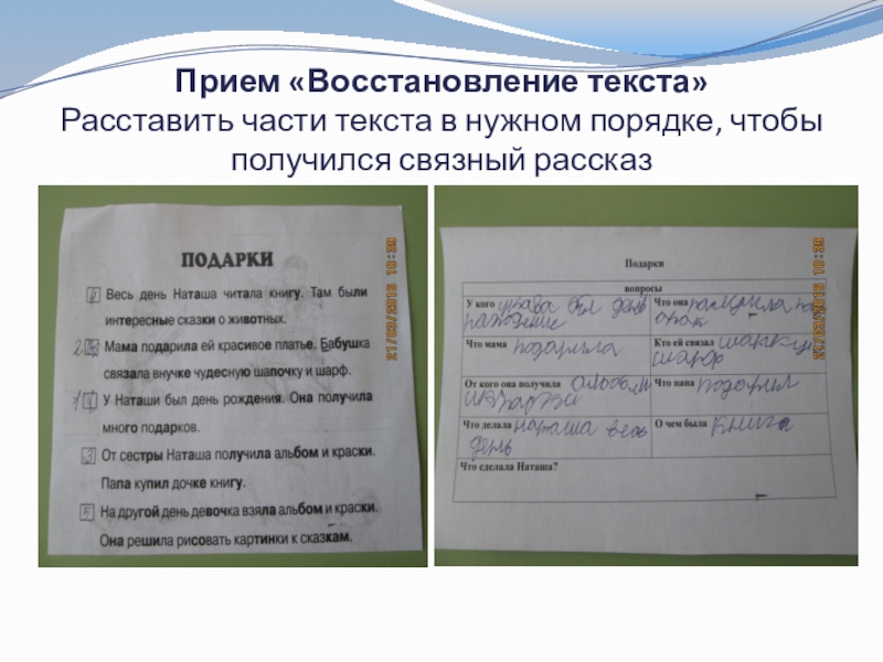 Слайд 6Прием «Восстановление текста» Расставить части текста в нужном порядке, чтобы получился связный