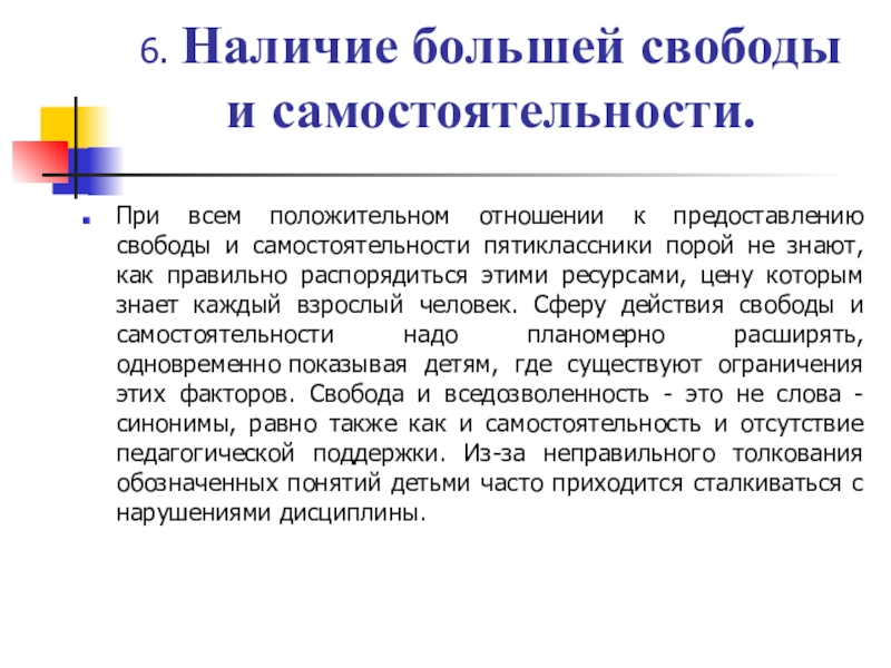 и самостоятельности пятиклассники порой не знают, как правильно распорядиться этими ресурсами, цену которым знает каждый взрослый человек. Сферу действия свободы и самостоятельности надо планомерно расширять, одновременно показывая детям, где существуют ограничения этих факторов. Свобода и вседозволенность - это не слова - синонимы, равно также как и самостоятельность и отсутствие педагогической поддержки. Из-за неправильного толкования обозначенных понятий детьми часто приходится сталкиваться с нарушениями дисциплины.