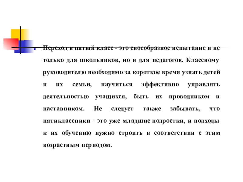 для школьников, но и для педагогов. Классному руководителю необходимо за короткое время узнать детей и их семьи, научиться эффективно управлять деятельностью учащихся, быть их проводником и наставником. Не следует также забывать, что пятиклассники - это уже младшие подростки, и подходы к их обучению нужно строить в соответствии с этим возрастным периодом.