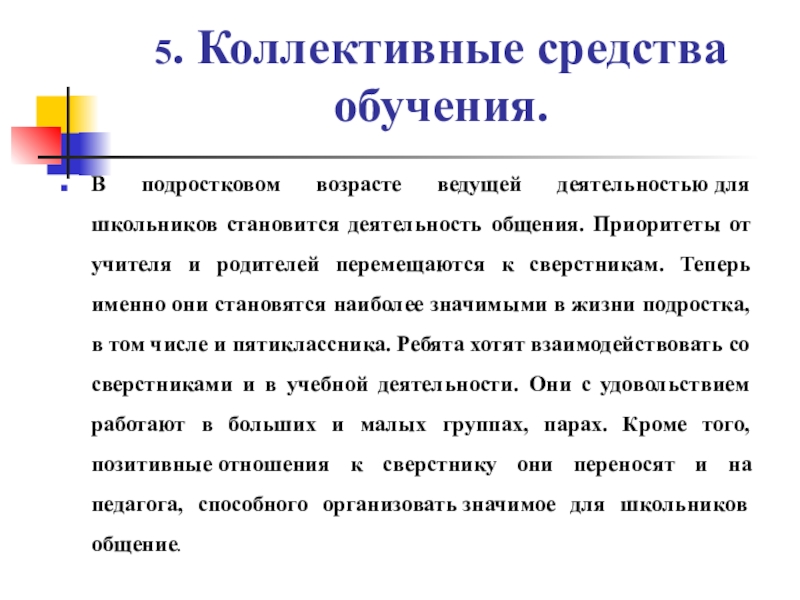 Приоритеты от учителя и родителей перемещаются к сверстникам. Теперь именно они становятся наиболее значимыми в жизни подростка, в том числе и пятиклассника. Ребята хотят взаимодействовать со сверстниками и в учебной деятельности. Они с удовольствием работают в больших и малых группах, парах. Кроме того, позитивные отношения к сверстнику они переносят и на педагога, способного организовать значимое для школьников общение.