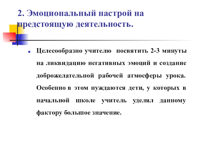 негативных эмоций и создание доброжелательной рабочей атмосферы урока. Особенно в этом нуждаются дети, у которых в начальной школе учитель уделял данному фактору большое значение.
