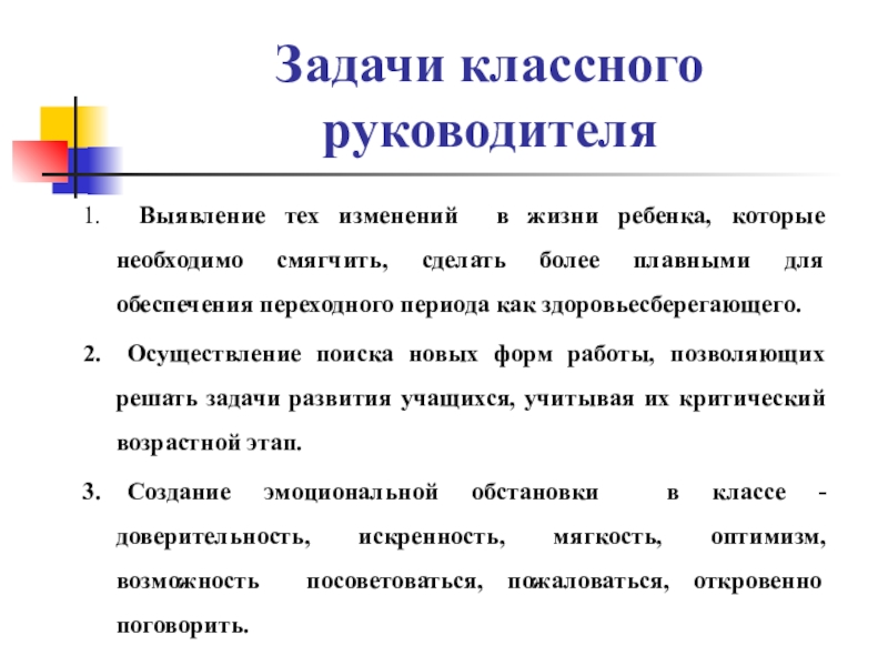3. Создание эмоциональной обстановки в классе - доверительность, искренность, мягкость, оптимизм, возможность посоветоваться, пожаловаться, откровенно поговорить.