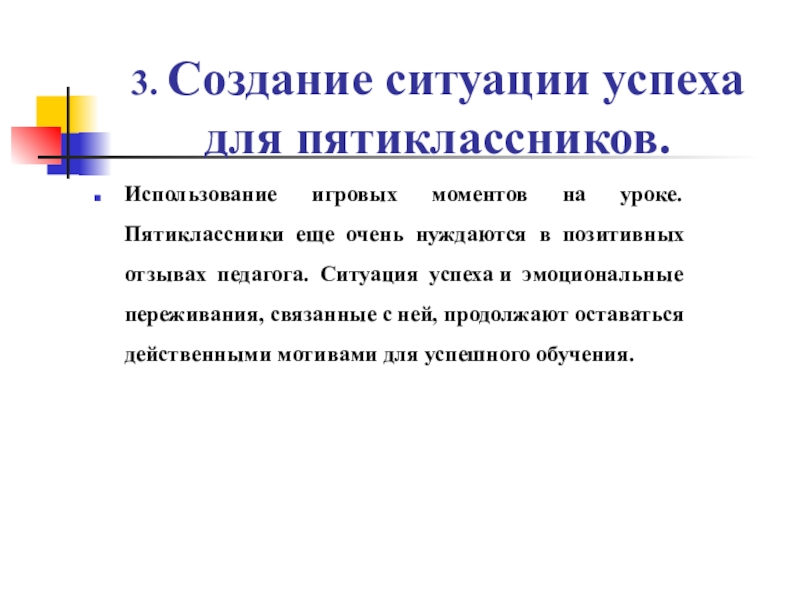 Пятиклассники еще очень нуждаются в позитивных отзывах педагога. Ситуация успеха и эмоциональные переживания, связанные с ней, продолжают оставаться действенными мотивами для успешного обучения.