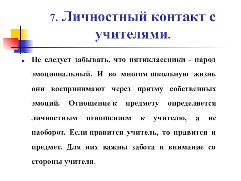 И во многом школьную жизнь они воспринимают через призму собственных эмоций. Отношение к предмету определяется личностным отношением к учителю, а не наоборот. Если нравится учитель, то нравится и предмет. Для них важны забота и внимание со стороны учителя.