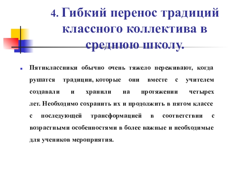 когда рушатся традиции, которые они вместе с учителем создавали и хранили на протяжении четырех лет. Необходимо сохранить их и продолжить в пятом классе с последующей трансформацией в соответствии с возрастными особенностями в более важные и необходимые для учеников мероприятия.
