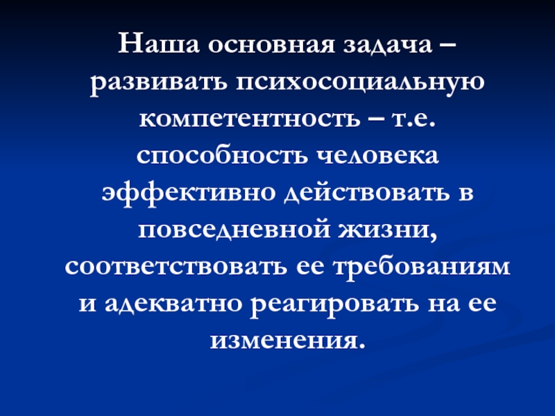 Наша основная задача – развивать психосоциальную компетентность – т.е. способность человека эффективно действовать в повседневной