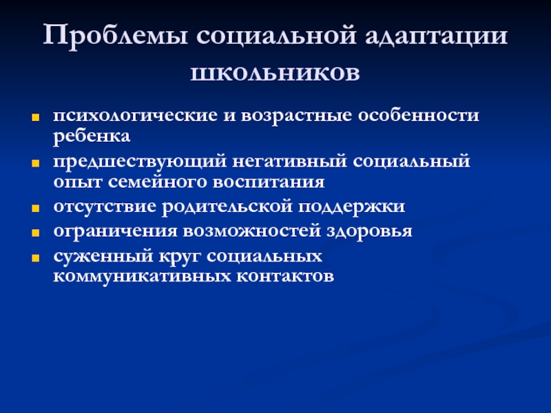 Проблемы социальной адаптации школьниковпсихологические и возрастные особенности ребенкапредшествующий негативный социальный опыт семейного воспитанияотсутствие родительской поддержки ограничения возможностей