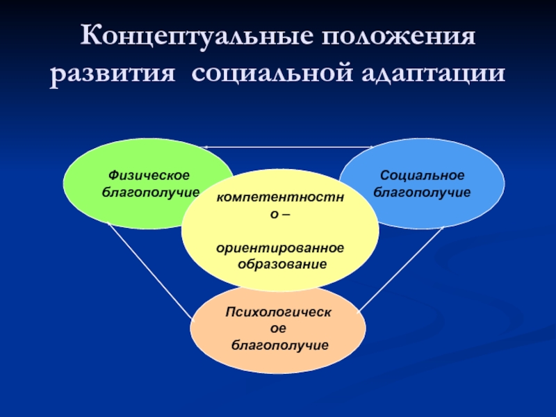 Концептуальные положения развития социальной адаптации Физическое благополучиеПсихологическое благополучиеСоциальное благополучиекомпетентностно – ориентированное образование