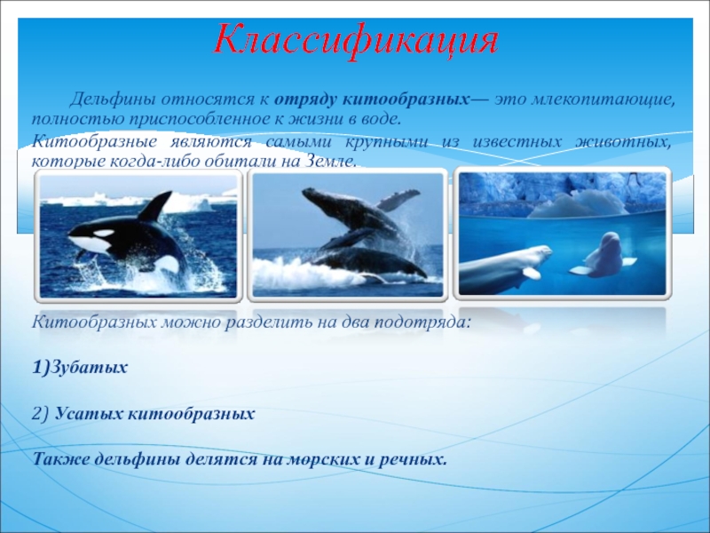 Хотя дельфины внешне напоминают больших рыб, на самом деле они являются млекопитающими. Они являются теплокровными, живородящими, дышащими воздухом животными. Дельфины также имеют много общего с сухопутными млекопитающими, включающими людей.