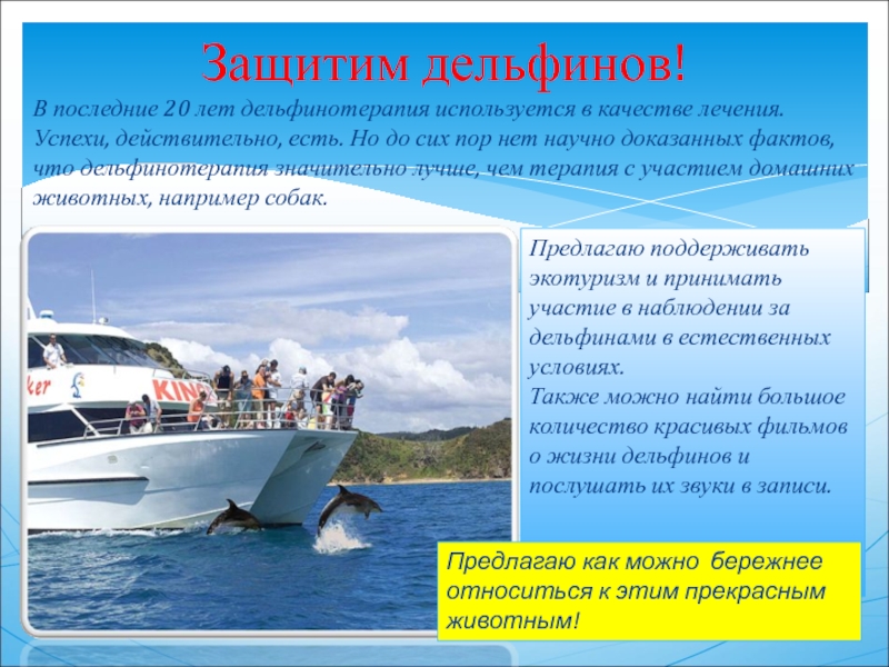 Предлагаю поддерживать экотуризм и принимать участие в наблюдении за дельфинами в естественных условиях.
