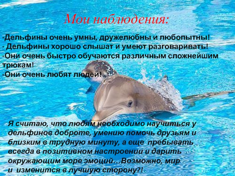 Я считаю, что людям необходимо научиться у дельфинов доброте, умению помочь друзьям и близким в трудную минуту, а еще пребывать всегда в позитивном настроении и дарить окружающим море эмоций…Возможно, мир и изменится в лучшую сторону?!