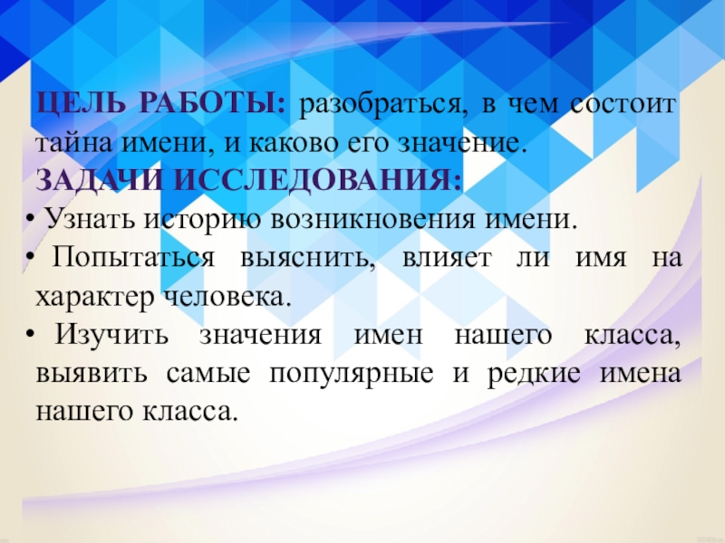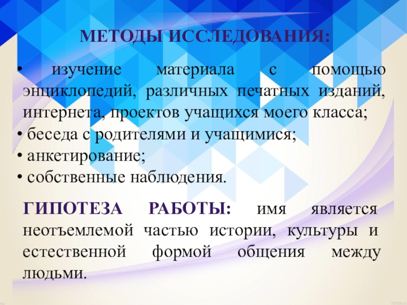 ГИПОТЕЗА РАБОТЫ: имя является неотъемлемой частью истории, культуры и естественной формой общения между людьми.