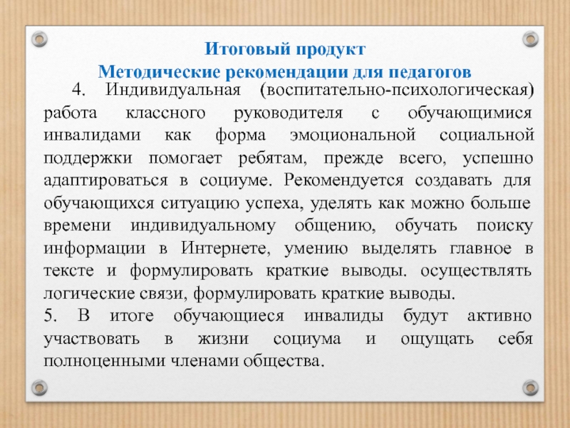 с обучающимися инвалидами как форма эмоциональной социальной поддержки помогает ребятам, прежде всего, успешно адаптироваться в социуме. Рекомендуется создавать для обучающихся ситуацию успеха, уделять как можно больше времени индивидуальному общению, обучать поиску информации в Интернете, умению выделять главное в тексте и формулировать краткие выводы. осуществлять логические связи, формулировать краткие выводы.