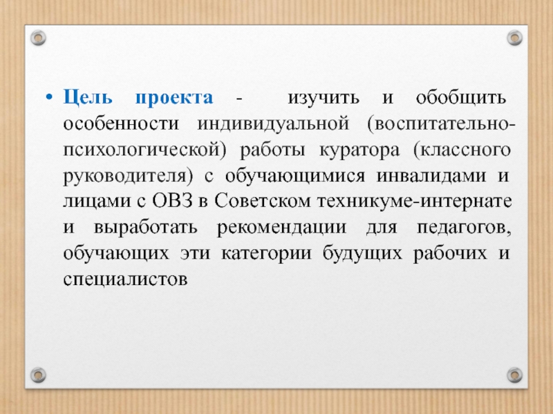 Слайд 5Цель проекта - изучить и обобщить особенности индивидуальной (воспитательно-психологической) работы куратора