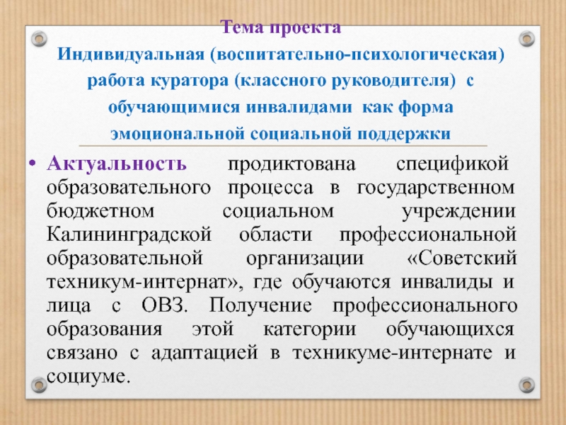 Актуальность продиктована спецификой образовательного процесса в государственном бюджетном социальном учреждении Калининградской области профессиональной образовательной организации «Советский техникум-интернат», где обучаются инвалиды и лица с ОВЗ. Получение профессионального образования этой категории обучающихся связано с адаптацией в техникуме-интернате и социуме.