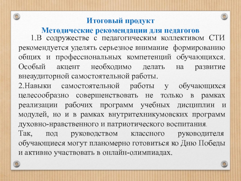 2.Навыки самостоятельной работы у обучающихся целесообразно совершенствовать не только в рамках реализации рабочих программ учебных дисциплин и модулей, но и в рамках внутритехникумовских программ духовно-нравственного и патриотического воспитания.