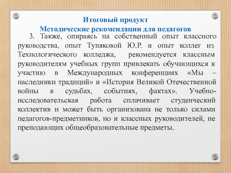 классного руководства, опыт Тупяковой Ю.Р. и опыт коллег из Технологического колледжа, рекомендуется классным руководителям учебных групп привлекать обучающихся к участию в Международных конференциях «Мы – наследники традиций» и «История Великой Отечественной войны в судьбах, событиях, фактах». Учебно-исследовательская работа сплачивает студенческий коллектив и может быть организована не только силами педагогов-предметников, но и классных руководителей, не преподающих общеобразовательные предметы.