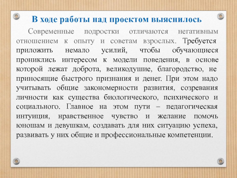 опыту и советам взрослых. Требуется приложить немало усилий, чтобы обучающиеся прониклись интересом к модели поведения, в основе которой лежат доброта, великодушие, благородство, не приносящие быстрого признания и денег. При этом надо учитывать общие закономерности развития, созревания личности как существа биологического, психического и социального. Главное на этом пути – педагогическая интуиция, нравственное чувство и желание помочь юношам и девушкам, создавать для них ситуацию успеха, развивать у них общие и профессиональные компетенции.