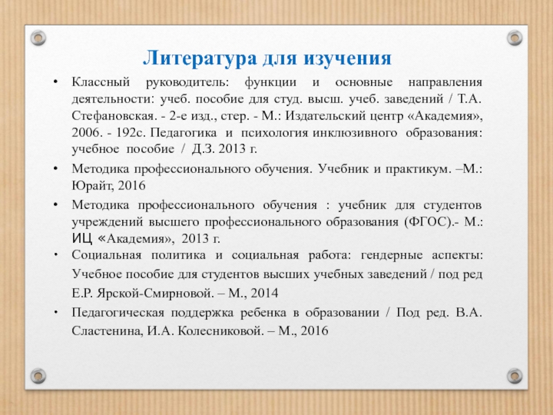 для студ. высш. учеб. заведений / Т.А. Стефановская. - 2-е изд., стер. - М.: Издательский центр «Академия», 2006. - 192с. Педагогика и психология инклюзивного образования: учебное пособие / Д.З. 2013 г.