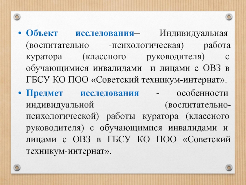 Предмет исследования - особенности индивидуальной (воспитательно-психологической) работы куратора (классного руководителя) с обучающимися инвалидами и лицами с ОВЗ в ГБСУ КО ПОО «Советский техникум-интернат».