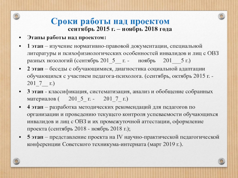1 этап – изучение нормативно-правовой документации, специальной литературы и психофизиологических особенностей инвалидов и лиц с ОВЗ разных нозологий (сентябрь 201_5__ г. - ноябрь 201___5 г.)