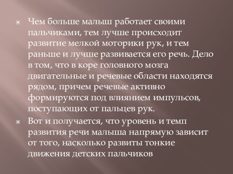 Слайд 3Чем больше малыш работает своими пальчиками, тем лучше происходит развитие мелкой