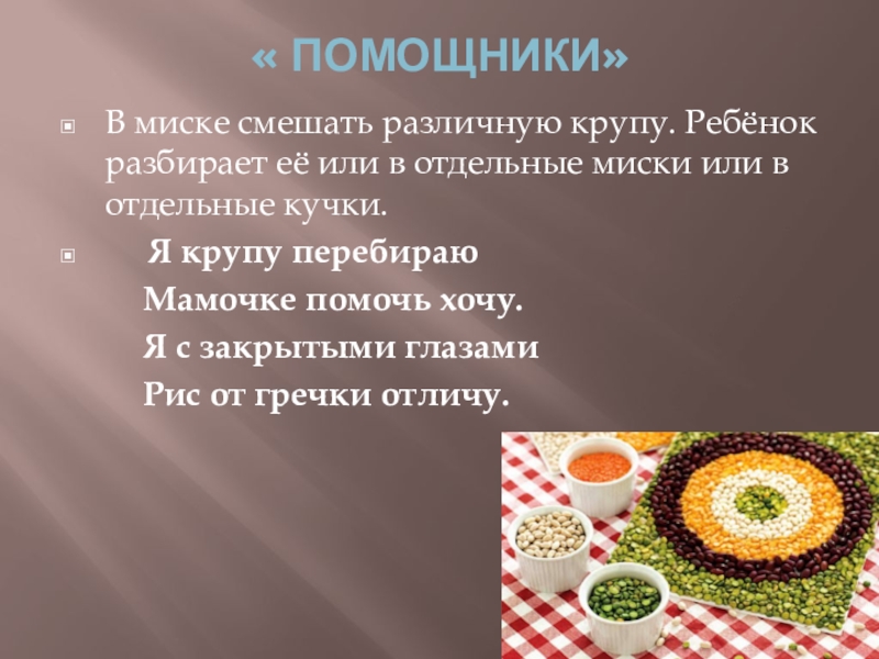 В миске смешать различную крупу. Ребёнок разбирает её или в