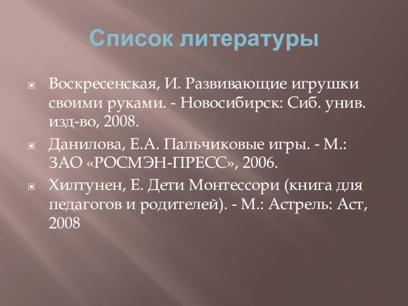 Данилова, Е.А. Пальчиковые игры. - М.: ЗАО «РОСМЭН-ПРЕСС», 2006.