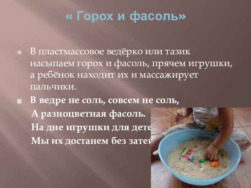 фасоль, прячем игрушки, а ребёнок находит их и массажирует пальчики.