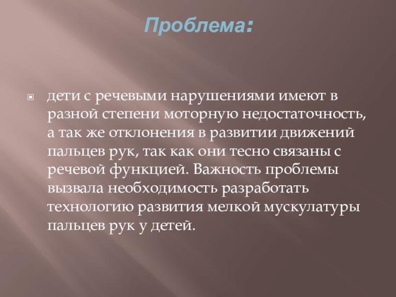 так же отклонения в развитии движений пальцев рук, так как они тесно связаны с речевой функцией. Важность проблемы вызвала необходимость разработать технологию развития мелкой мускулатуры пальцев рук у детей.