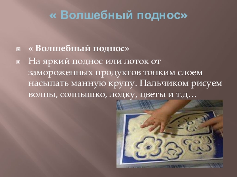 продуктов тонким слоем насыпать манную крупу. Пальчиком рисуем волны, солнышко, лодку, цветы и т.д…