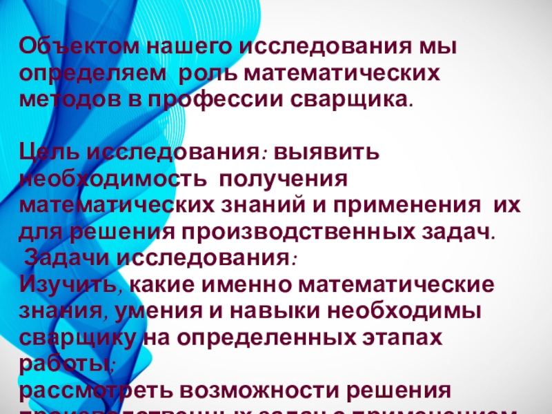 Слайд 19Объектом нашего исследования мы определяем роль математических методов в профессии сварщика.