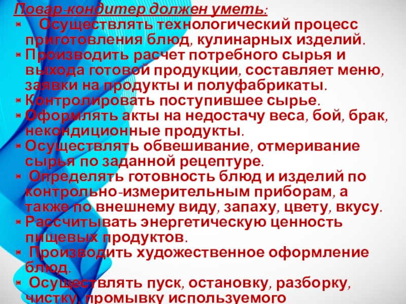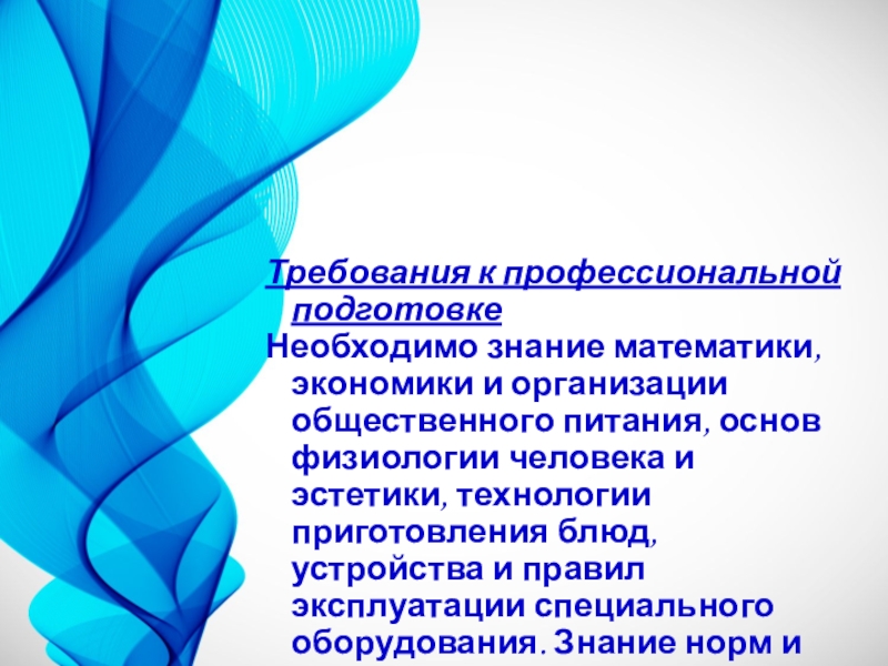 основ физиологии человека и эстетики, технологии приготовления блюд, устройства и правил эксплуатации специального оборудования. Знание норм и принципов современного права.
